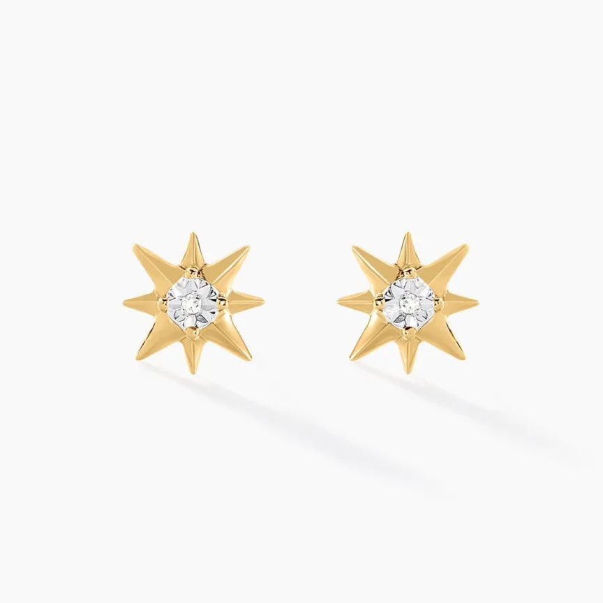 Boucles D’oreilles Puces Or Jaune 375/1000 Etoile Diamants 0.007cts Illusion
