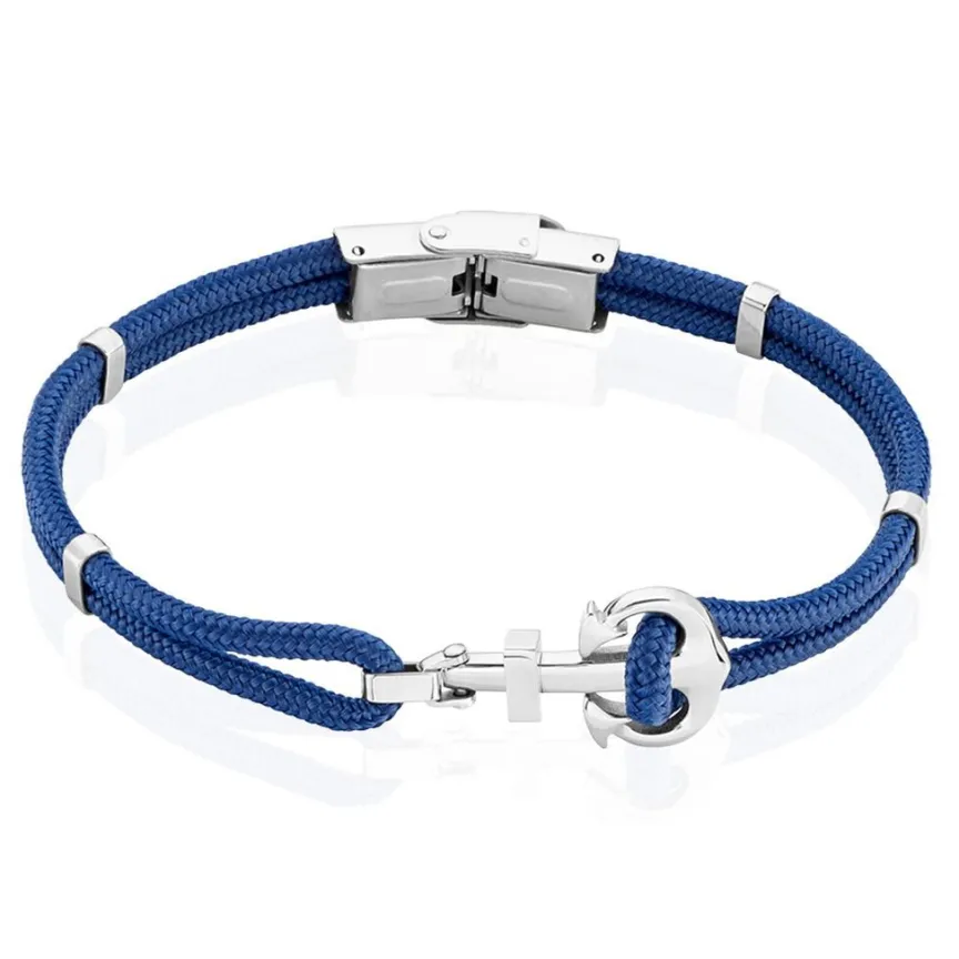 Bracelet Acier Inoxydable Blanc Motif Ancre Et Cordon Nautique Bleu 21cm