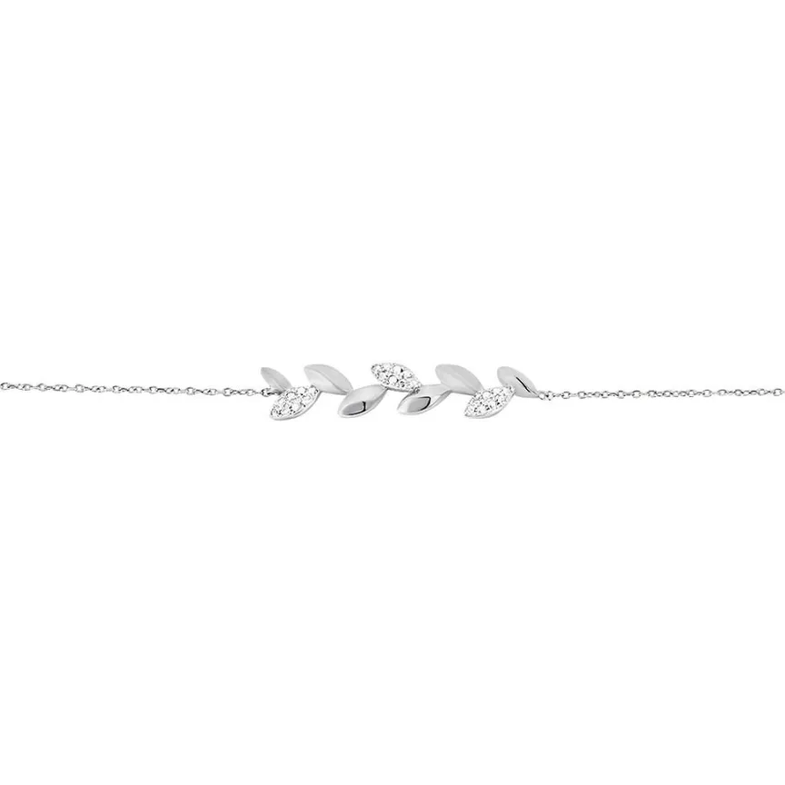Bracelet Or Blanc 375/1000 Barrette Motifs Feuilles Semi Pavage Diamants 18.5cm