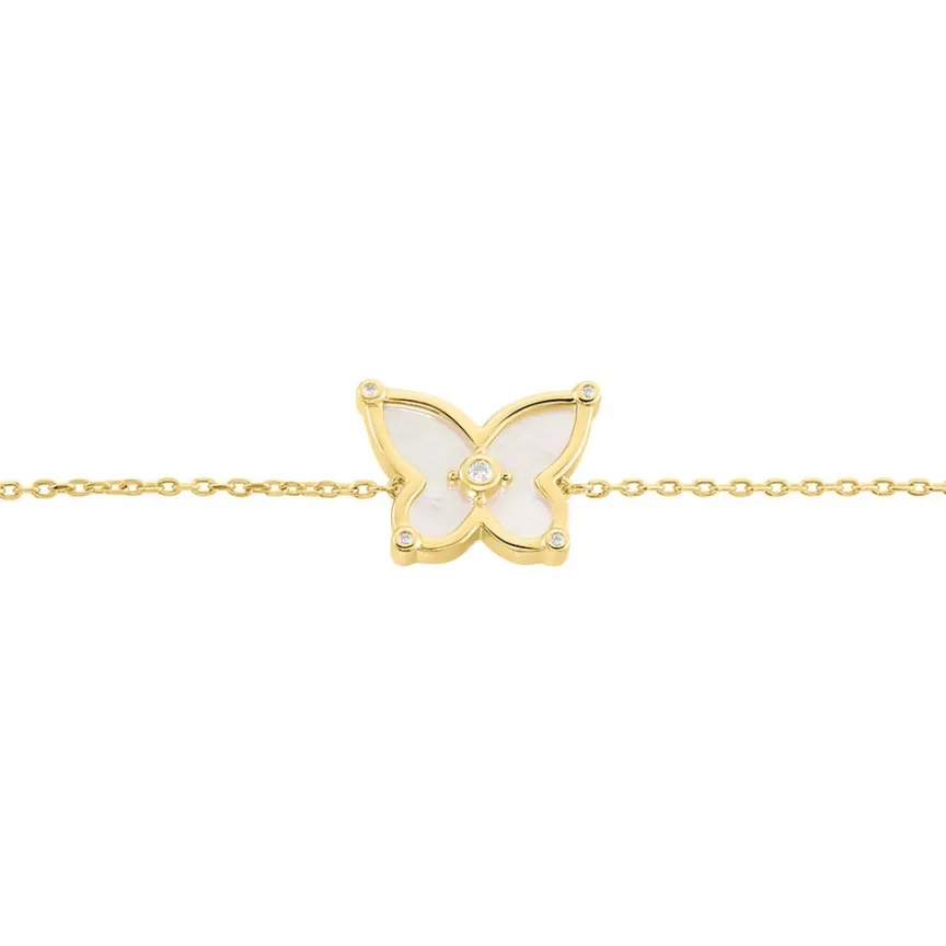 Bracelet Plaqué Or Papillon Nacre Blanche Oxydes De Zirconium Maille Forçat 19cm