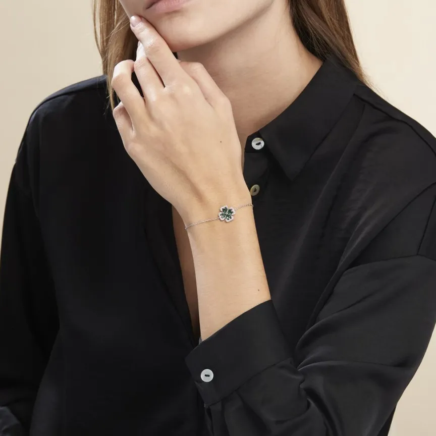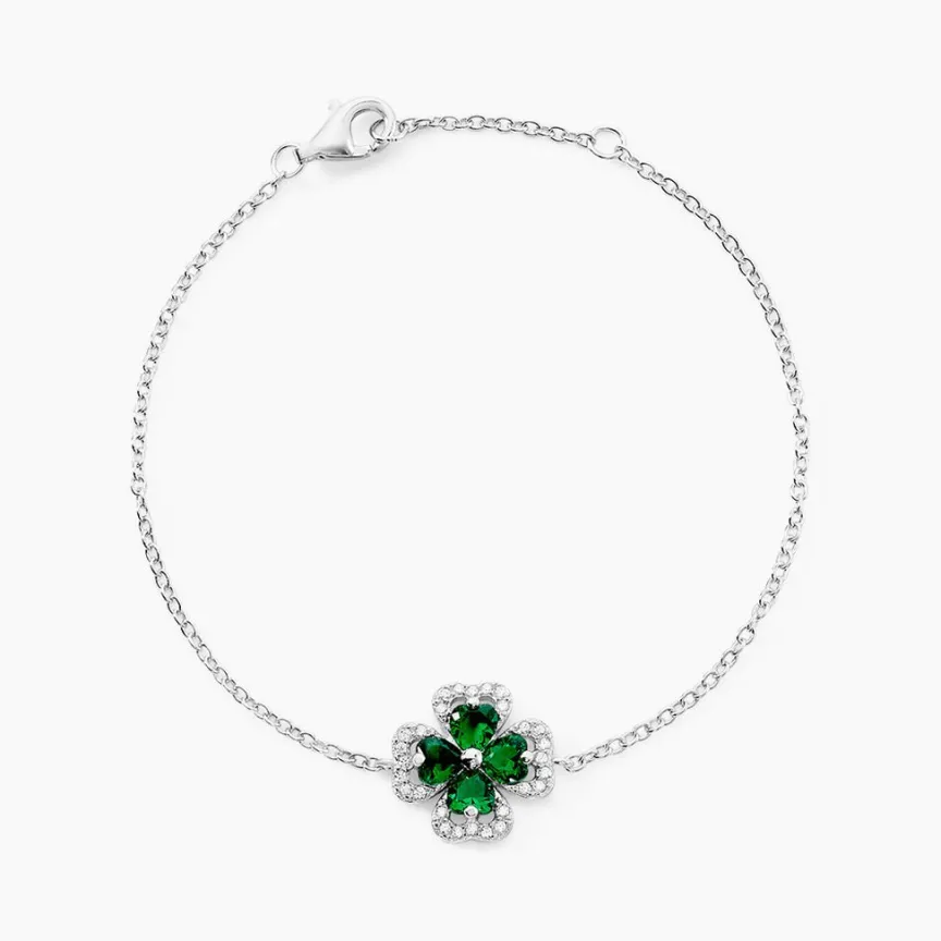 Bracelet Argent Blanc 925/1000 Fleur En Verre Verte Et Oxydes De Zirconium Serti Griffes Maille Forçat 18cm
