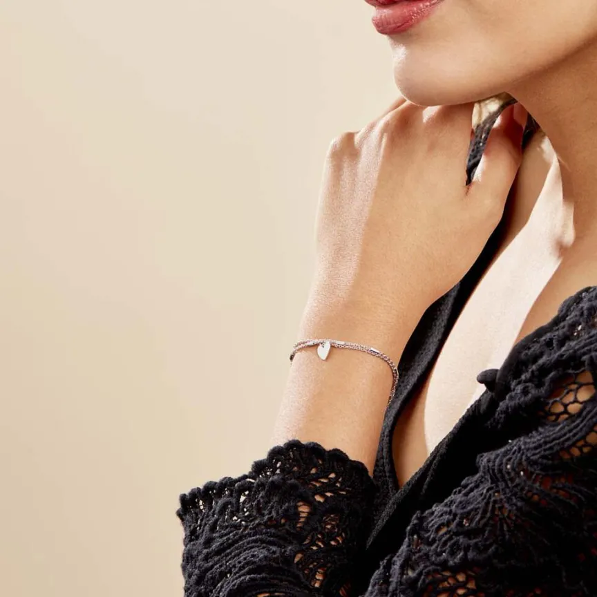 Bracelet Argent Blanc 925/1000 Pampille C艙ur Double Mailles Forcat Et Fantaisie 18.5cm