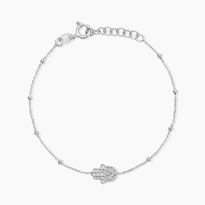 Bracelet Argent Blanc 925/1000 Main De Fatma Maille Boules 18cm