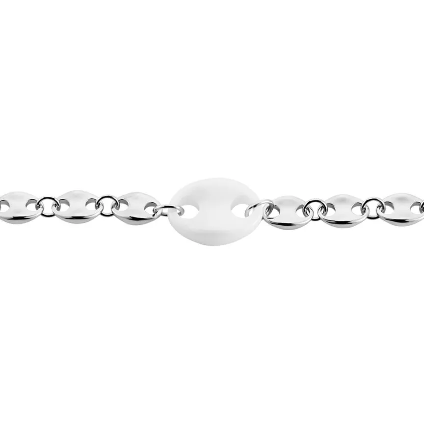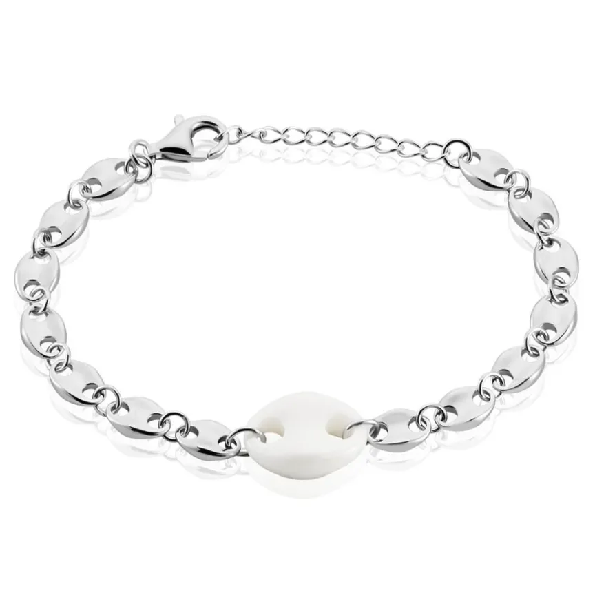 Bracelet Argent Blanc 925/1000 Grain De Café Ceramique Blanche Maille Grain De Café 19cm
