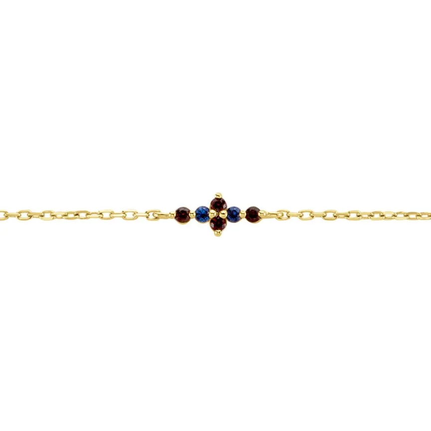 Bracelet Plaqué Or Fleur Pierres De Synthèses Bleues Et Marrons Maille Forçat 19cm