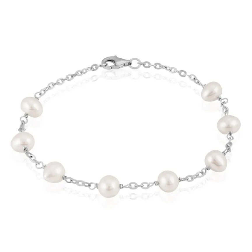 Bracelet Argent Blanc 925/1000 Perles De Culture Nacre 6/6.5mm Maille Forcat 18.5cm