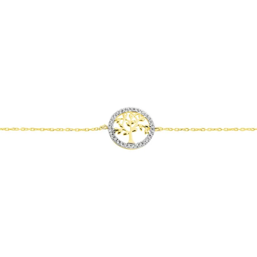 Bracelet Or Jaune 375/1000 Arbre De Vie Micro Pavage Oxydes De Zirconium Maille Forçat 16+2cm