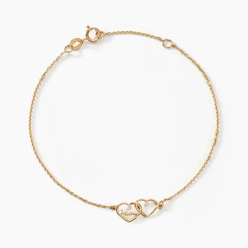 Bracelet Or Jaune 375/1000 Double C艙urs Ajoures Avec Message Effet Satine Et Glitter Maille Jaseron 16+2cm
