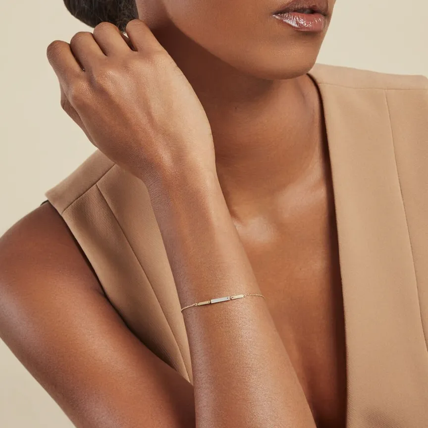 Bracelet Or Jaune 375/1000 Barre Rectangle Nacre Blanche Maille Jaseron 16+2cm