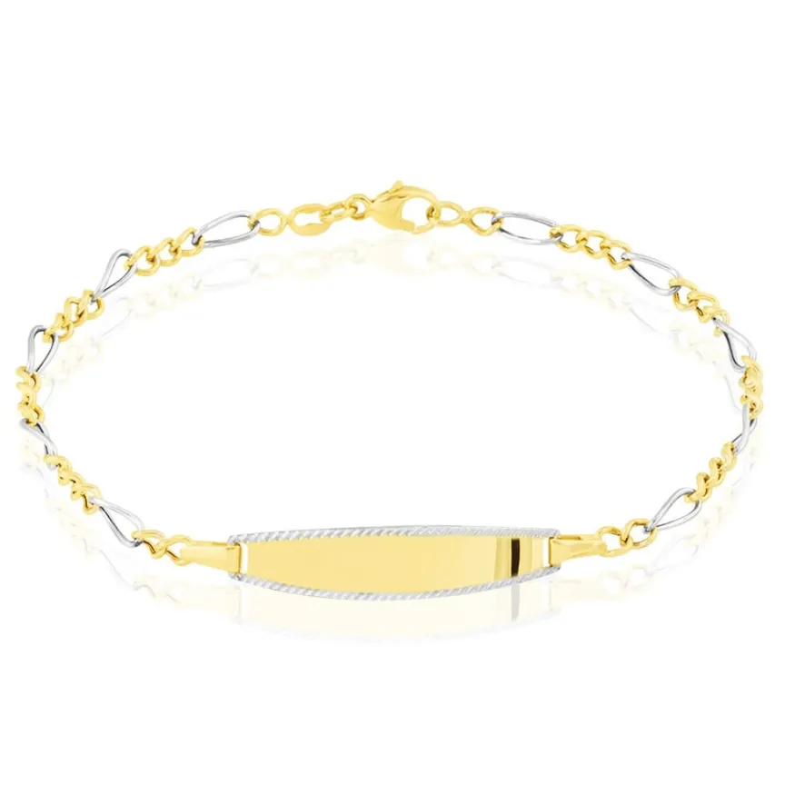 Bracelet Identite Bebe Or Bicolore 375/1000 Plaque Ovale Ciselee Maille Alternee 1/3 15cm