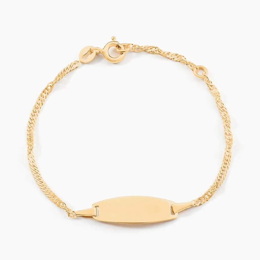 Bracelet Identite Bebe Or Jaune 375/1000 Plaque Ovale Maille Singapour 13.5cm