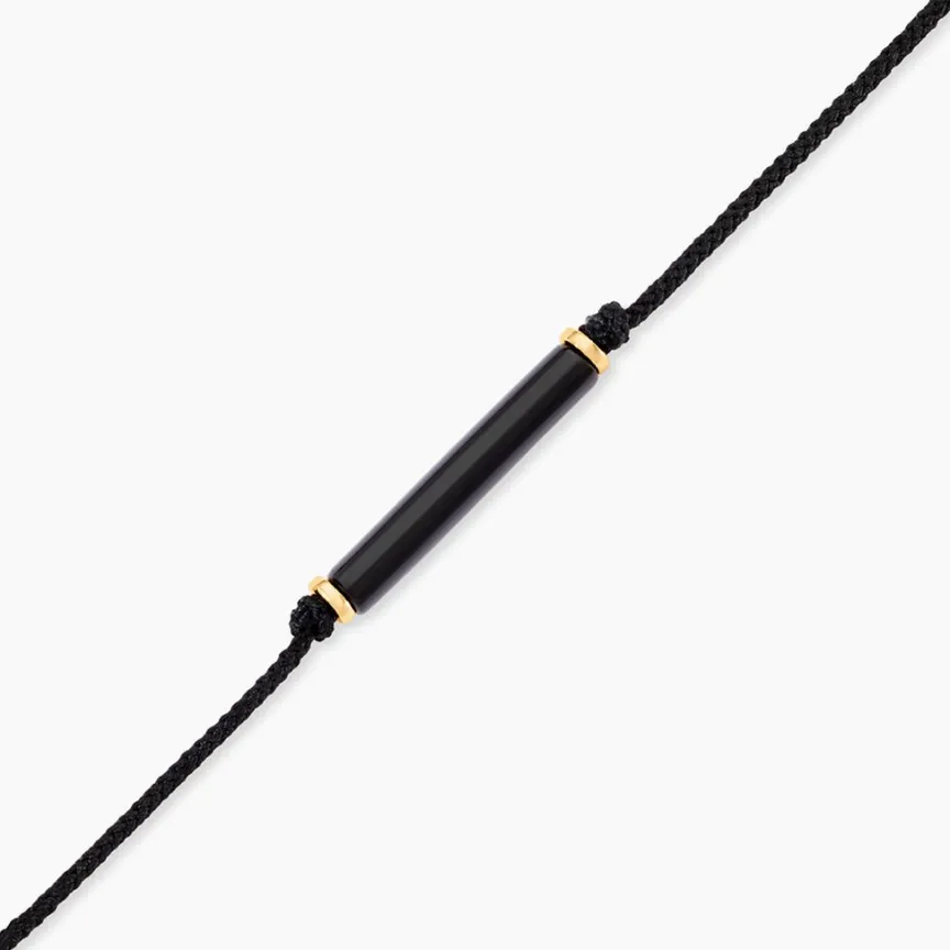Bracelet Or Jaune 375/1000 Cylindre Onyx Cordon Nylon Noir 28Cm Ajustable