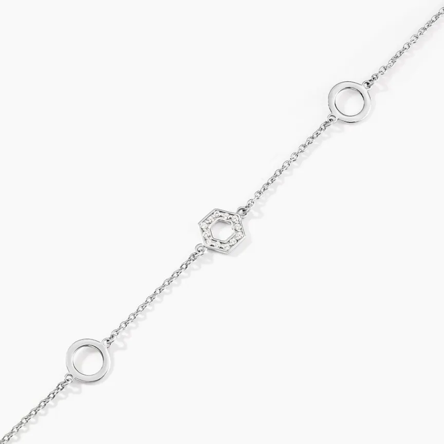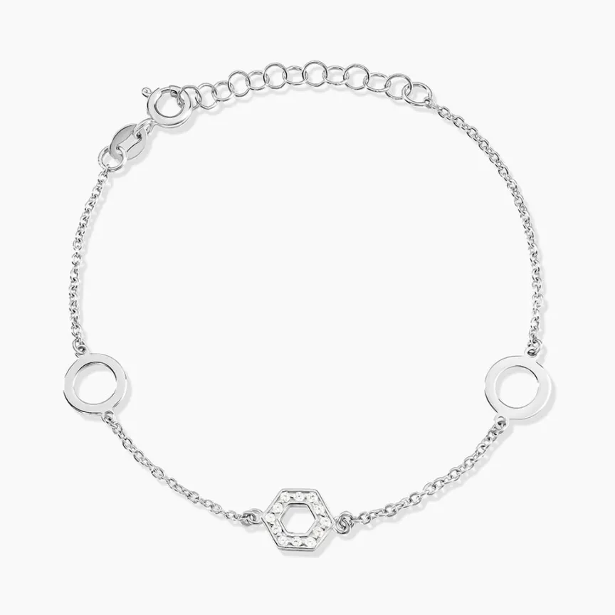 Bracelet Argent Blanc 925/1000 Hexagone Et Cercles Ajourés Pavage Oxydes De Zirconium Maille Forçat 16+3cm