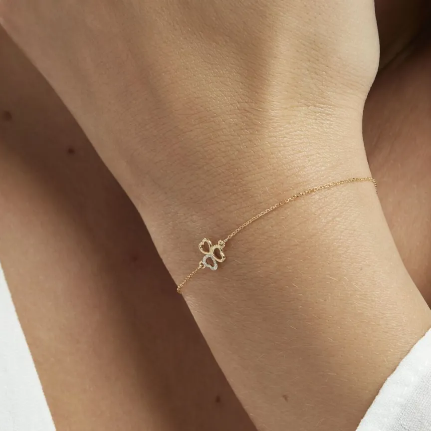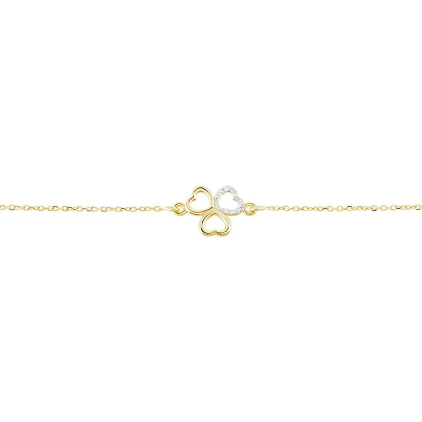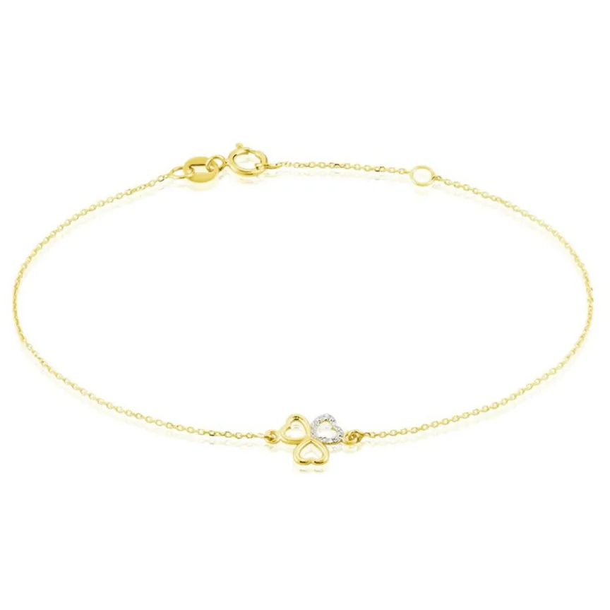 Bracelet Or Jaune 375/1000 Triple Coeurs Motif Trefle Dont 1 C艙ur Glitter Argente Maille Jaseron 16+2cm
