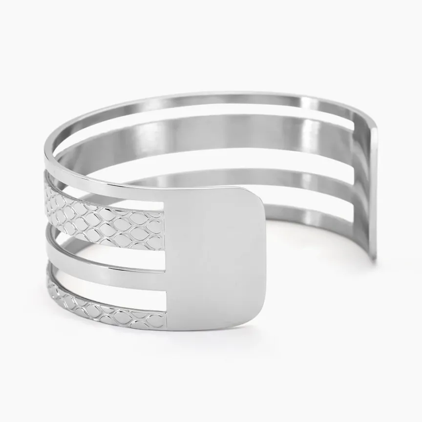 Bracelet Manchette Acier Inoxydable Blanc Ouvert 4 Anneaux Larges Ajoures Alternes Lisses Et Reptile Pm