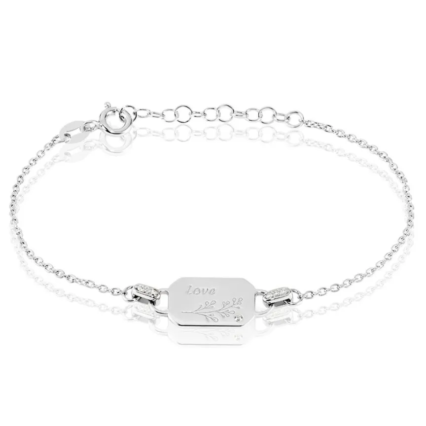 Bracelet Argent 925/1000 Médaille Fleur Et Message Love Maille Forçat Sertis Oxydes De Zirconium 18.5cm