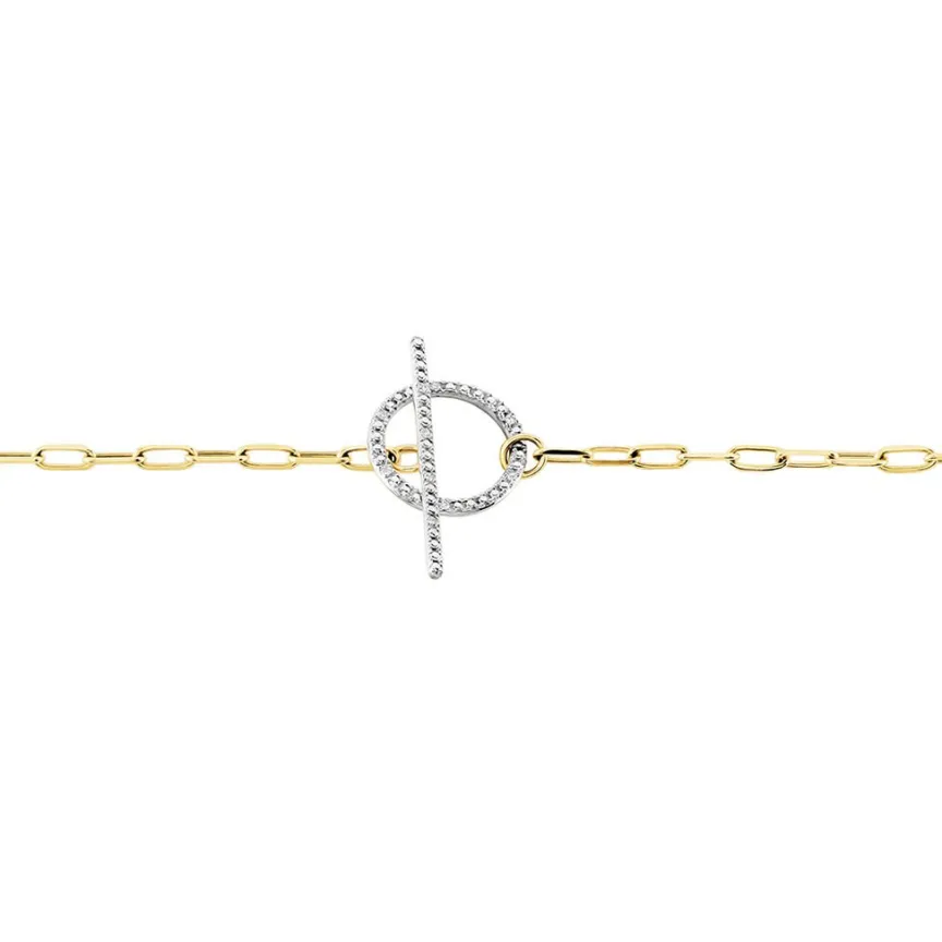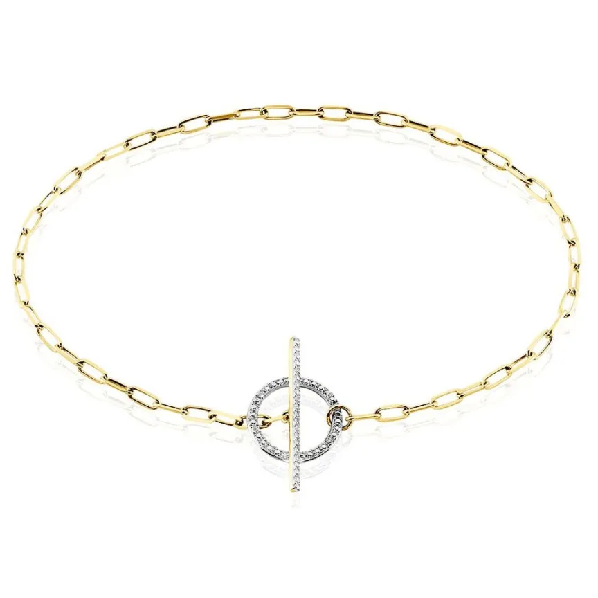 Bracelet Or Jaune 375/1000 Cercle Ajouré Diamants 0.023cts Maille Cheval 17cm