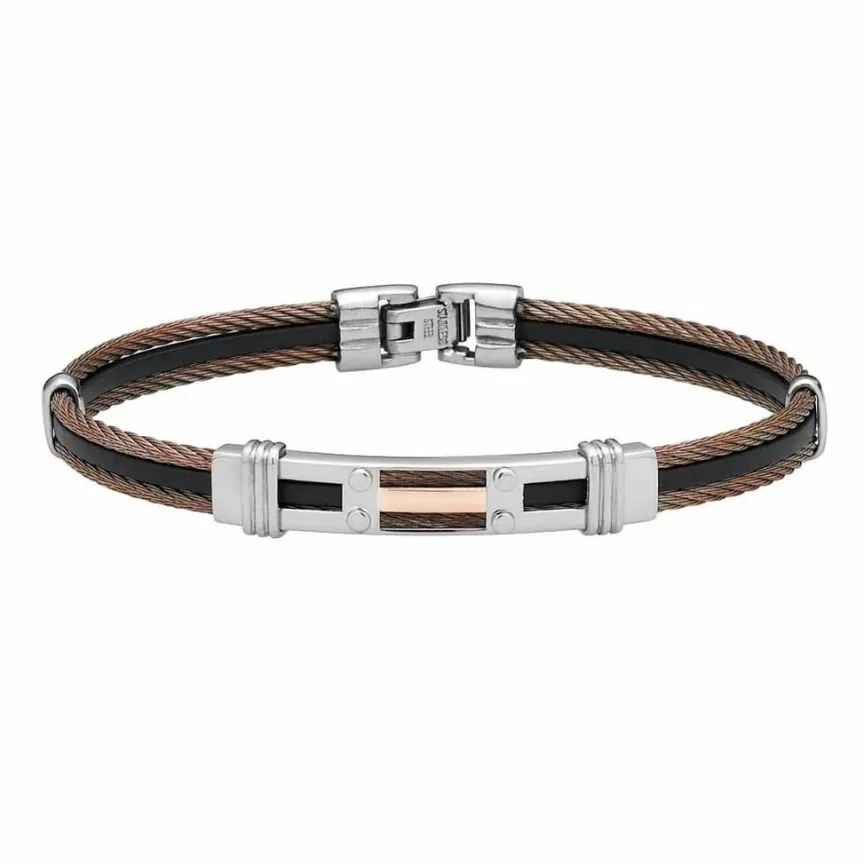Bracelet Or Rose Et Acier + Cables Marron Et Caoutchouc 18.5/19cm