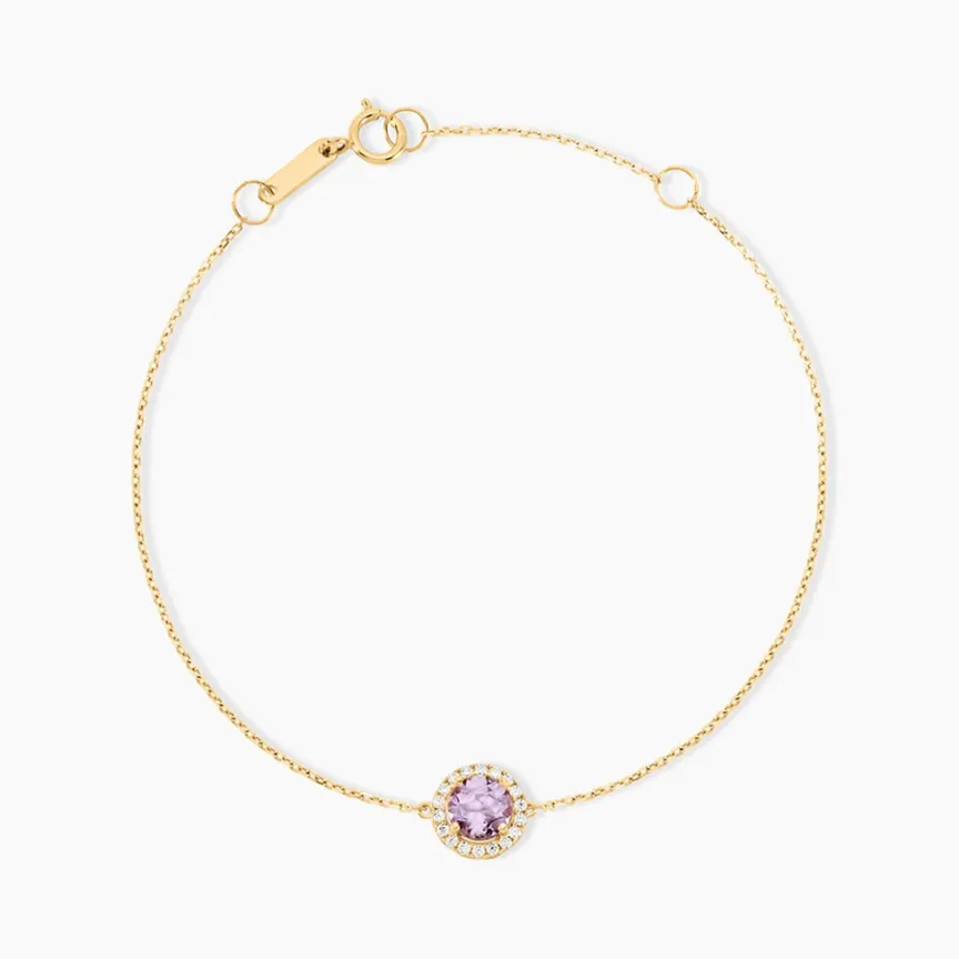 Bracelet Or Jaune 375/1000 Solitaire Amethyste 0,3Cts Serti 4 Griffes Entourage Oxyde De Zirconium Maille Forcat 16+2Cm
