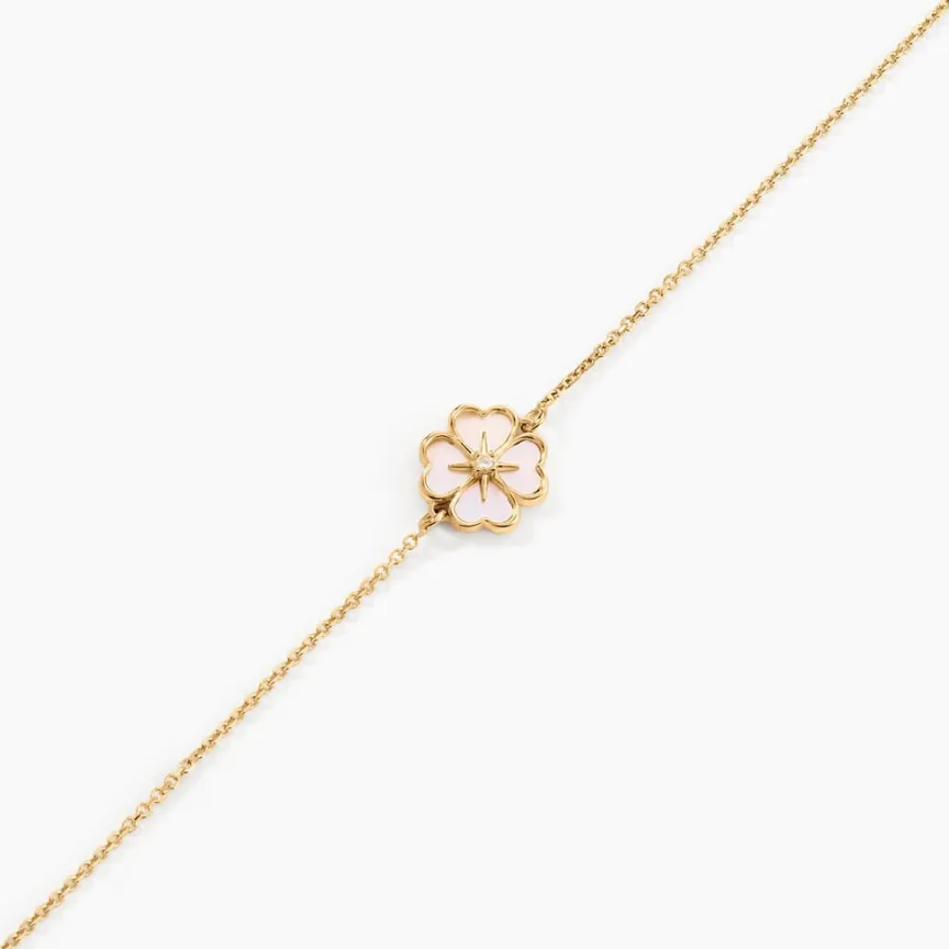 Bracelet Or Jaune 375/1000 Fleur De Trefle Nacre Blanche 1 Oxyde De Zirconium Serti 4 Griffes Maille Jaseron 16+2cm