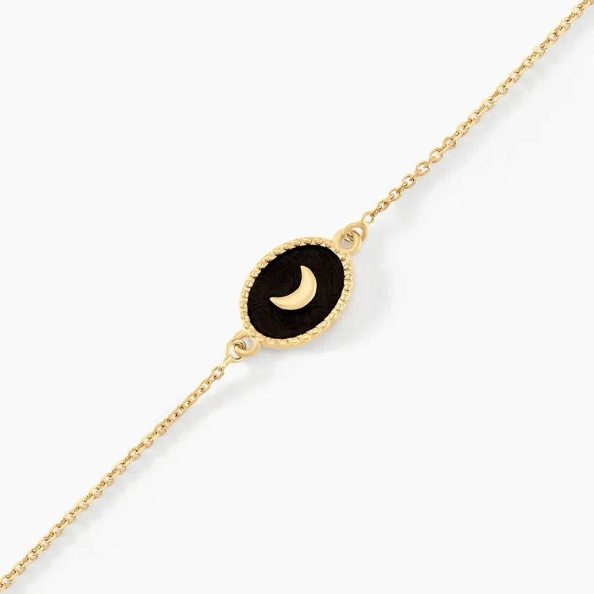 Bracelet Or Jaune 375/1000 Medaille Ovale Effet Perle Email Noir Mat Motif Lune Maille Jaseron 16+2cm