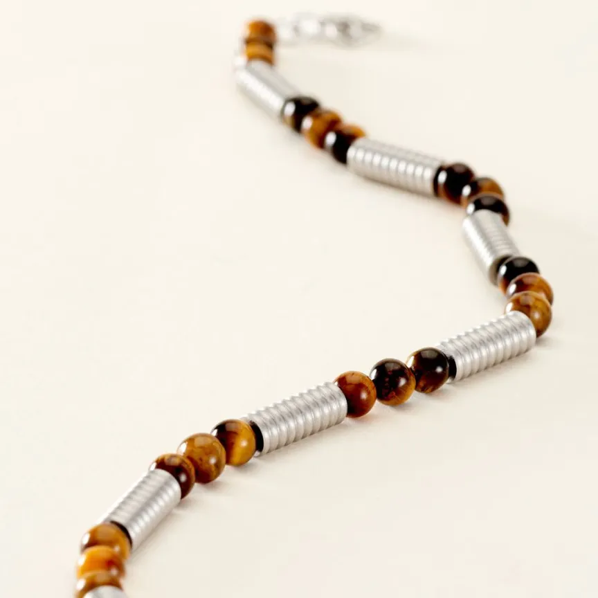 Bracelet Acier Blanc Cylindre 艙il De Tigre Jaune 19+2cm
