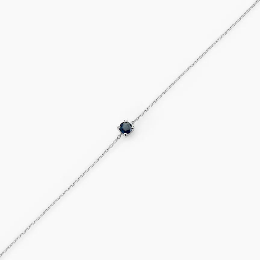 Bracelet Solitaire Or Blanc 375/1000 Saphir Serti Griffes 0.12ct Maille Forçat 15cm