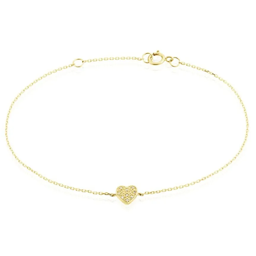 Bracelet Or Jaune 375/1000 Coeur Pavage Diamants Maille Forcat 16+2cm