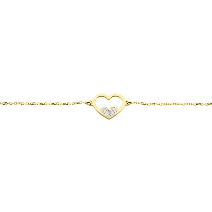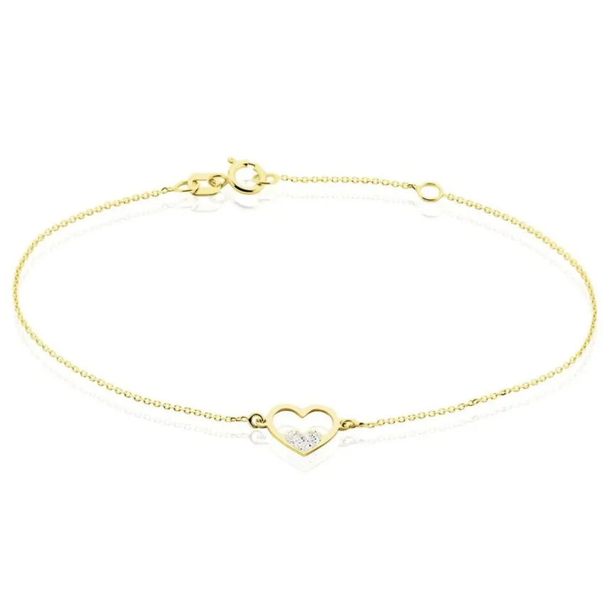 Bracelet Or Jaune 375/1000 Double Coeurs Avec Un Coeur Glitter Argente Maille Jaseron 16+2cm