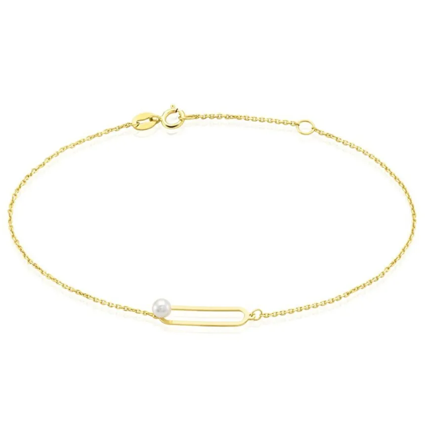 Bracelet Or Jaune 375/1000 Perle De Culture 3-3.5mm Maille Forçat 18cm