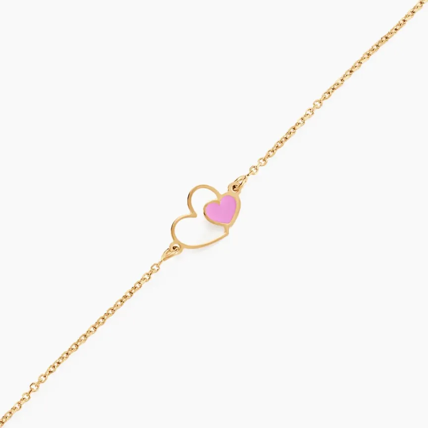 Bracelet Or Jaune 375/1000 Double Coeurs Smalto Rose Maille Jaseron 14/16cm