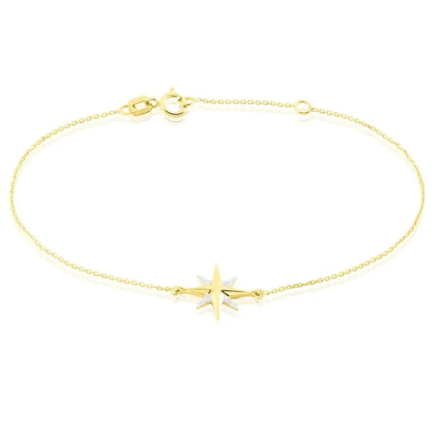 Bracelet Or Jaune 375/1000 Etoile Du Nord Glitter Argente Maille Jaseron 16+2cm
