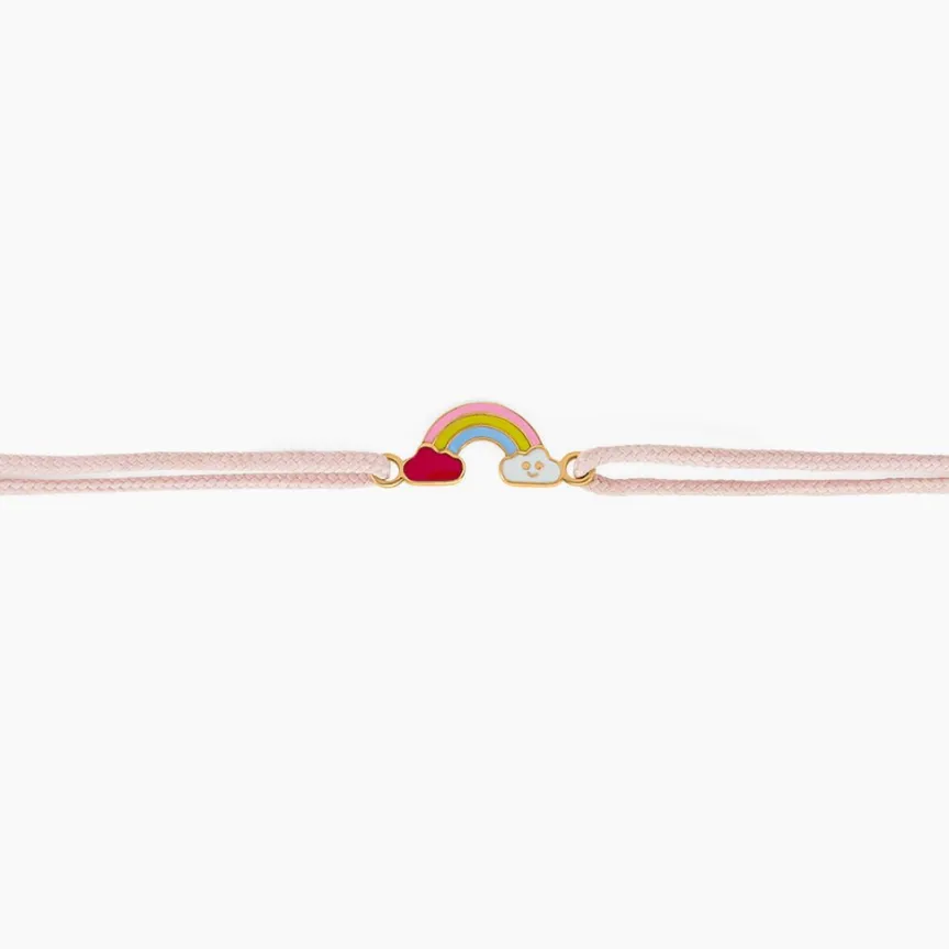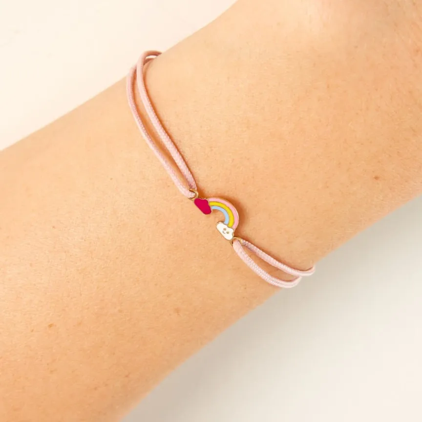 Bracelet Or Jaune 375/1000 Arc En Ciel Email Multicolore Cordon Coton Rose