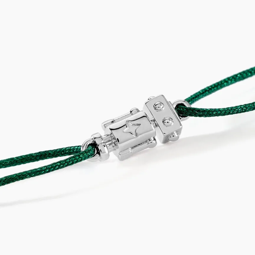 Bracelet Argent Blanc 925/1000 Robot Cordon Ajustable Vert 20cm