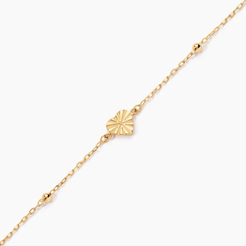Bracelet Or Jaune 375/1000 C艙ur Strie Boules Maille Jaseron 16+2cm