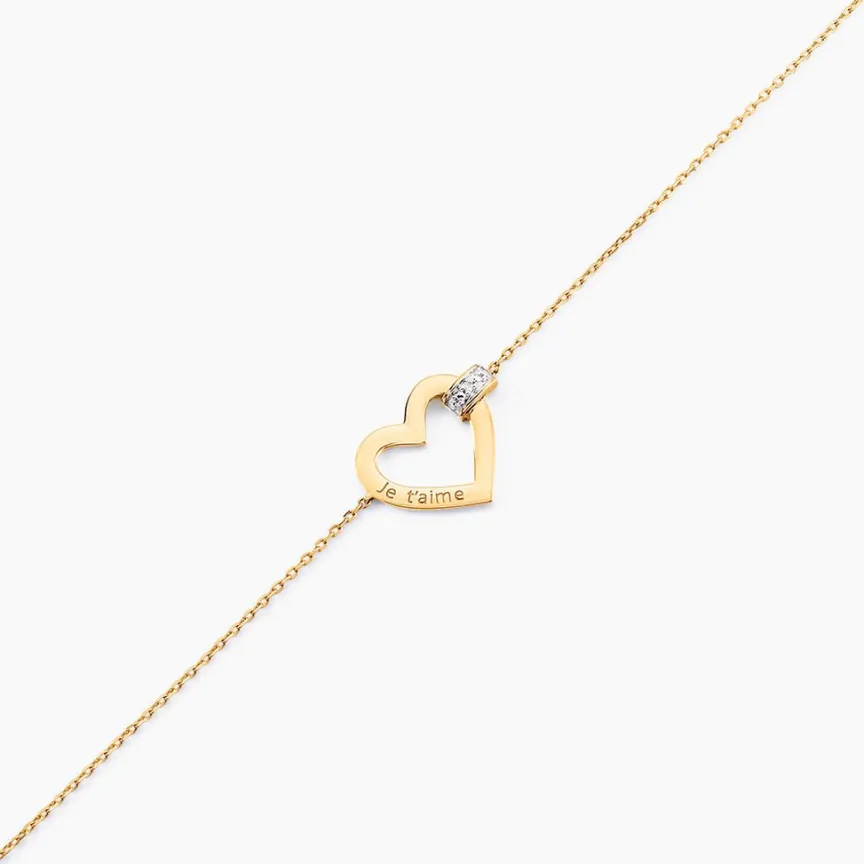 Bracelet Or Jaune 375/1000 C艙ur Ajoure Avec Message Je T’aime Pavage Diamants Maille Forcat 16+2cm