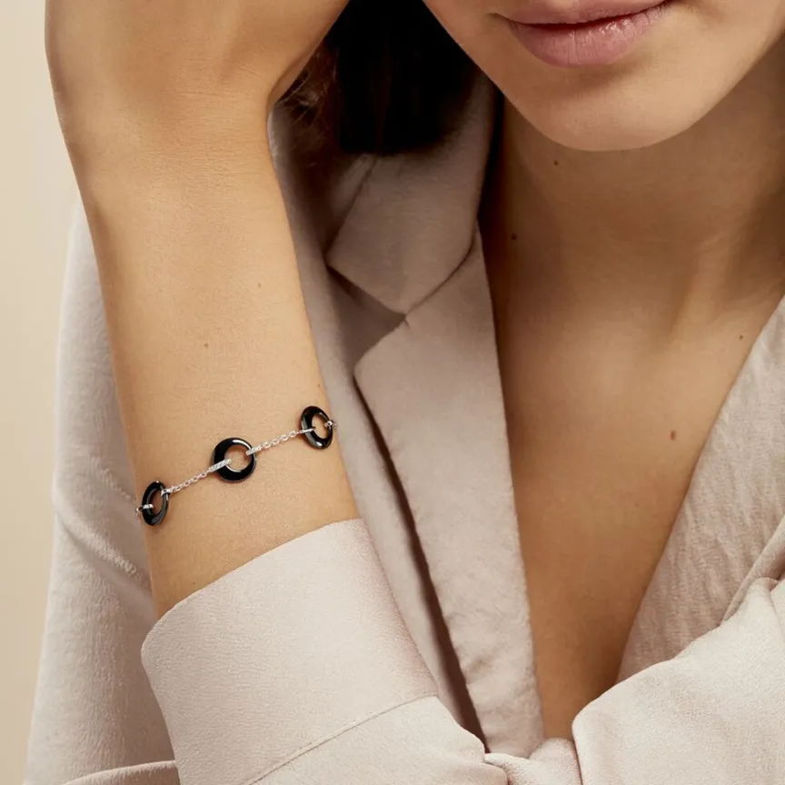 Bracelet Argent Blanc 925/1000 Ceramique Noire Formes Rondes Ajourees Et Oxydes De Zirconium 19cm