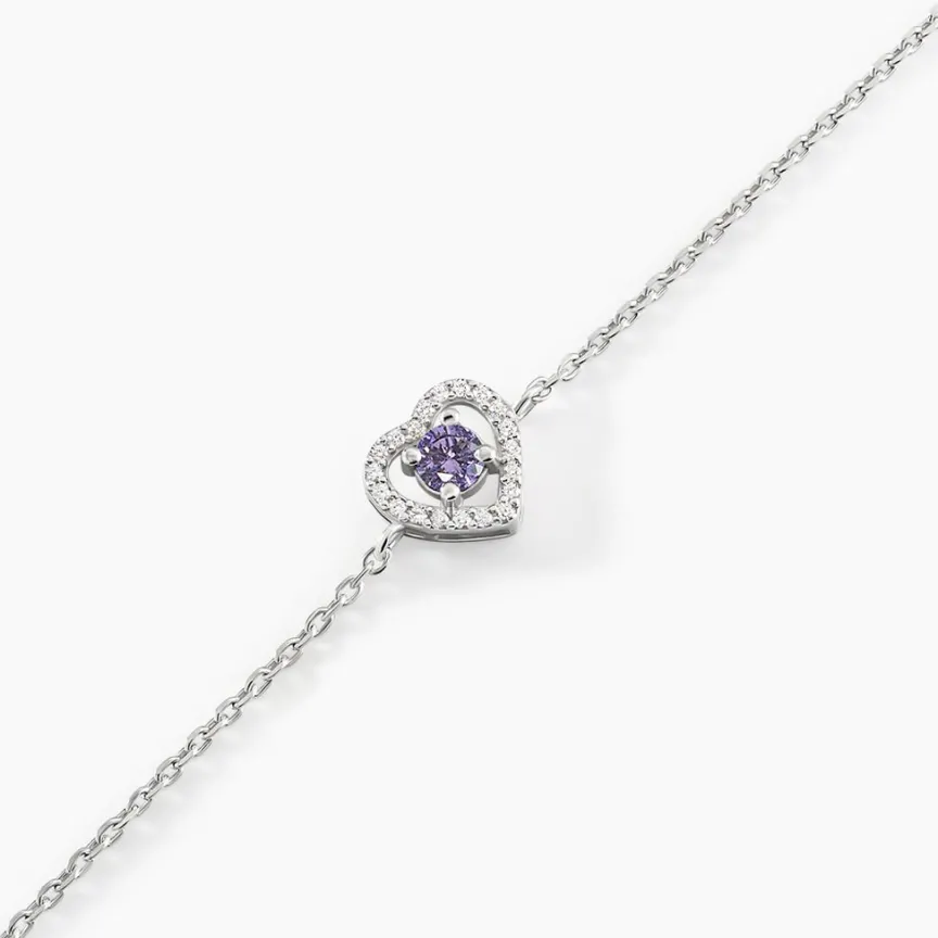 Bracelet Argent Blanc 925/1000 C艙ur Oxyde De Zirconium Aubergine Et Pavage Maille Forçat 16+2cm