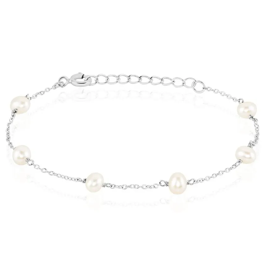 Bracelet Argent Blanc 925/1000 Perles De Culture 4-4.5 Mm Maille Forçat 18.5cm