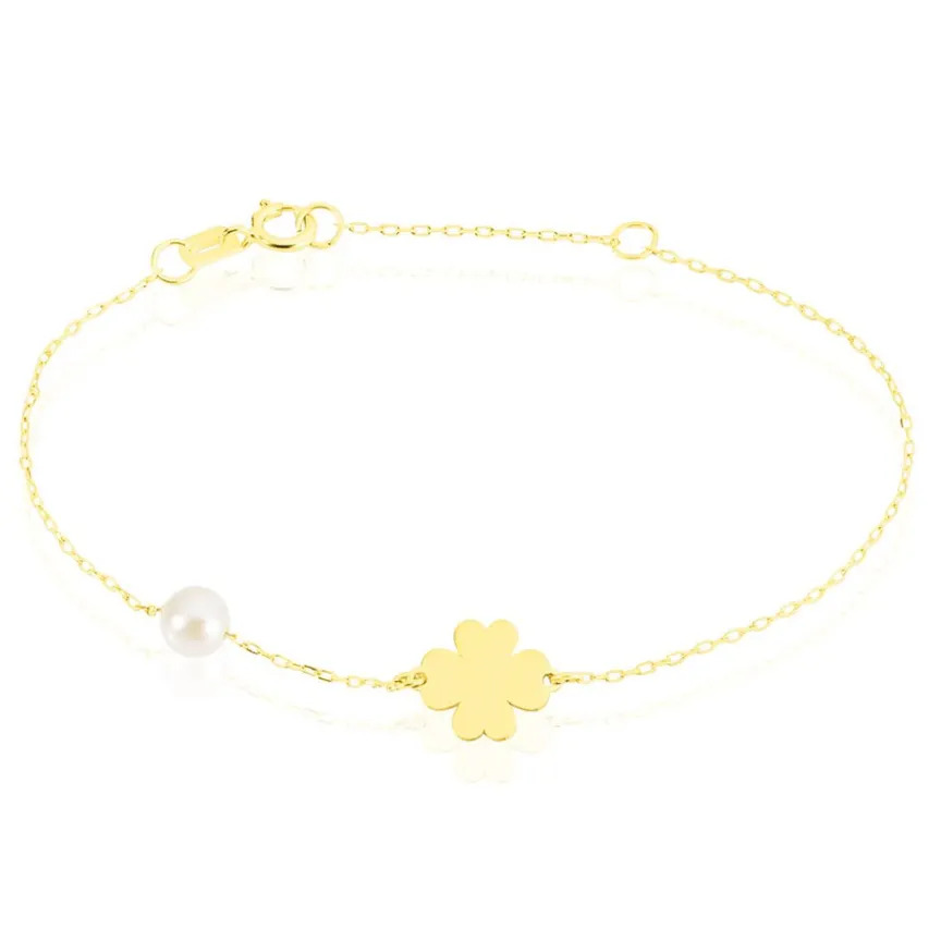 Bracelet Or Jaune 375/1000 Trèfle Et Perle De Culture 15cm