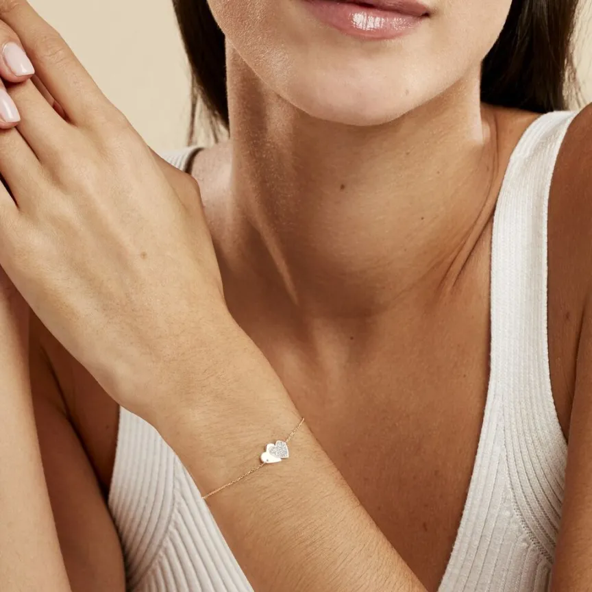 Bracelet Or Jaune 375/1000 Double C艙urs Dont Un Coeur Glitter Argente Maille Jaseron 16+2cm
