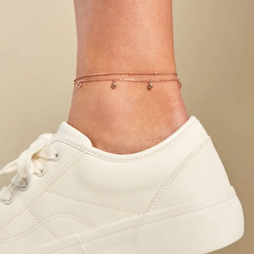 Chaîne De Cheville Argent Rose 925/1000 Oxydes De Zirconium Champagne Double Rang Mailles Forçat Et Boules 23+3cm