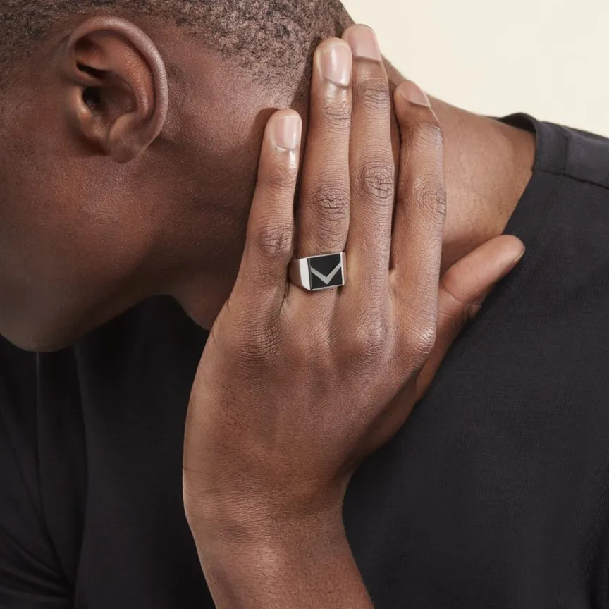 Chevalière Argent Blanc 925/1000 Forme Carré Email Noir