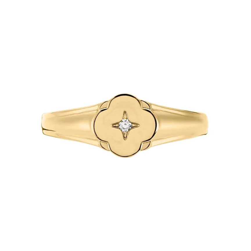 Chevalière Plaqué Or Jaune Plateau Forme Trèfle Oxydes De Zirconium