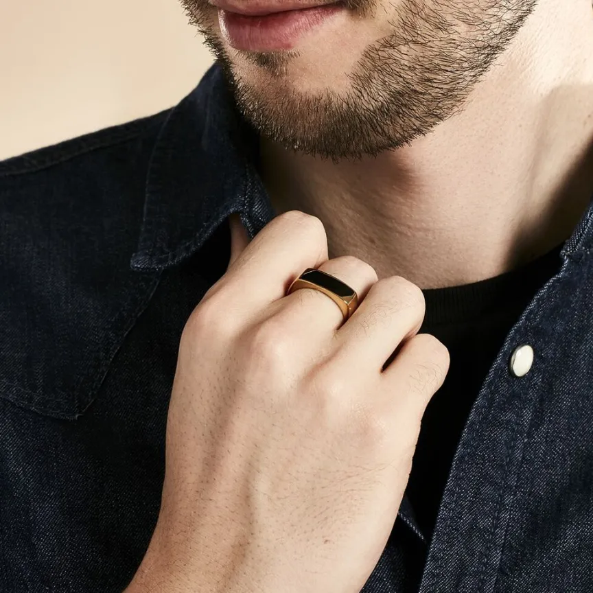Chevaliere Plaque Or Jaune Plateau Rectangle Email Noir