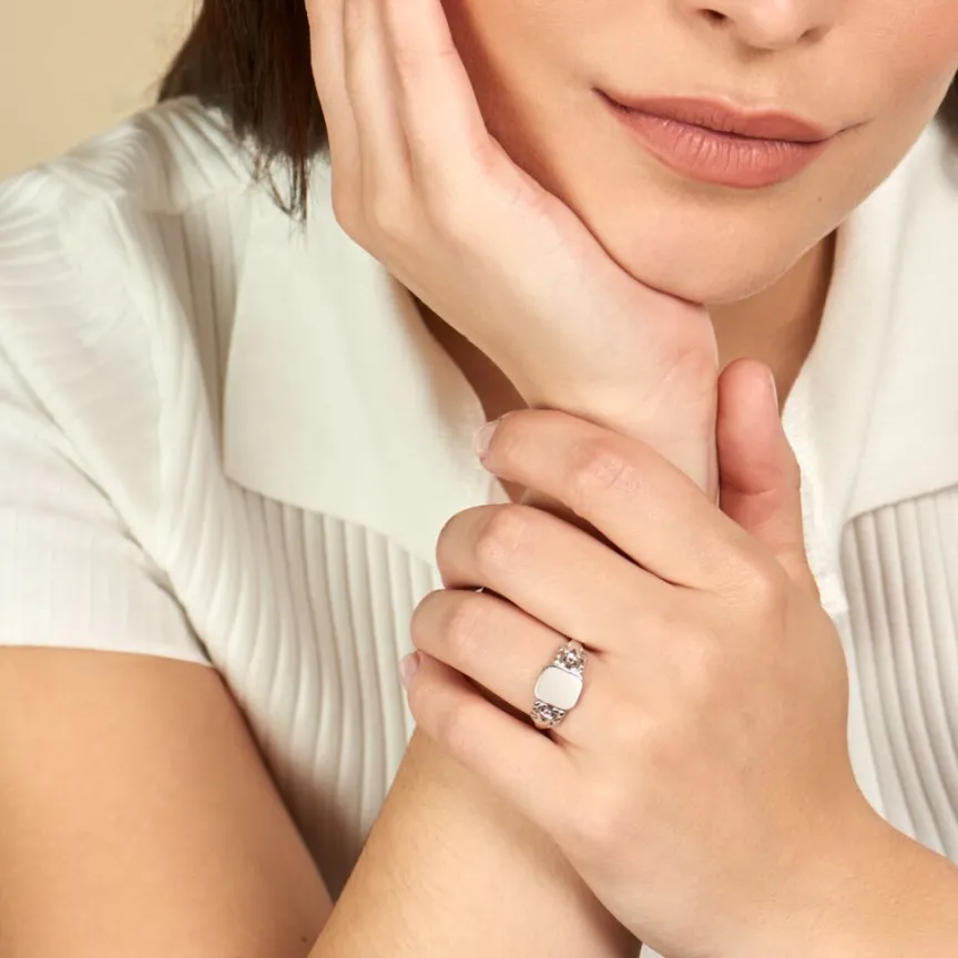 Chevaliere Argent Blanc 925/1000 Plateau Carre Corps De Bague Arabesques