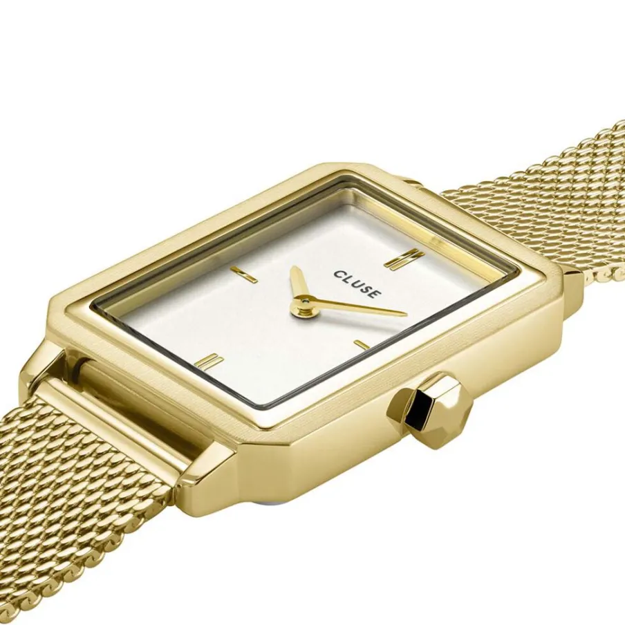 Montre Cluse Fluette Acier Doré Rectangulaire Quartz 30.6mm Fond Blanc Bracelet Milanais Acier Doré Cw11508