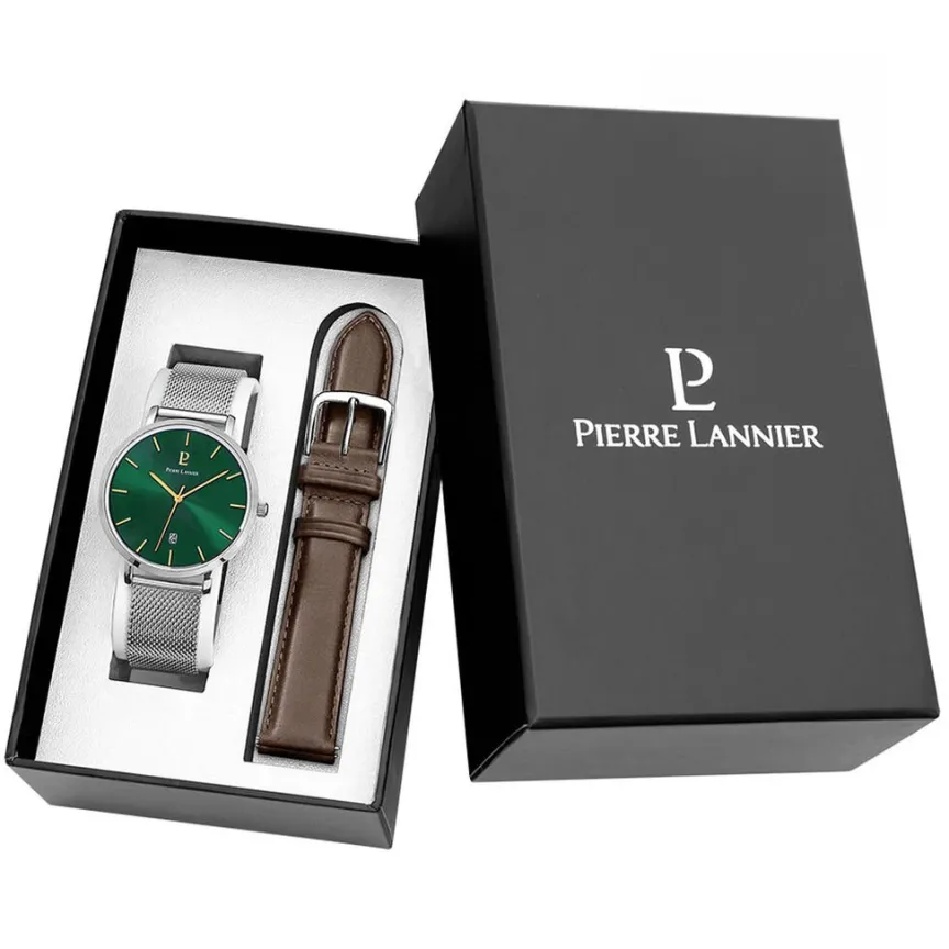Coffret De Montre Pierre Lannier Echo Acier Argenté Ronde Quartz 40mm Fond Vert Bracelet Acier Argenté Milanais + Bracelet Cuir Marron 457c161