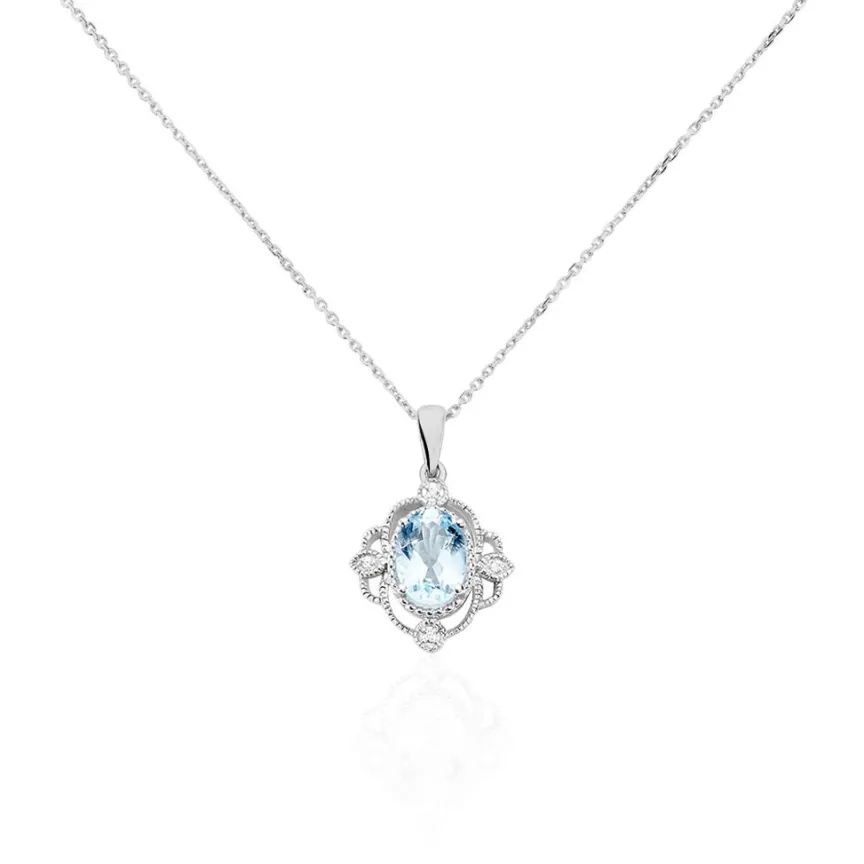 Collier Or Blanc 375/1000 Motif Arabesques Effet Perle Oxydes De Zirconium Et Topaze 42cm