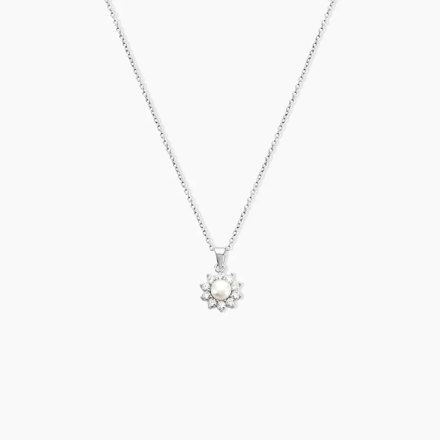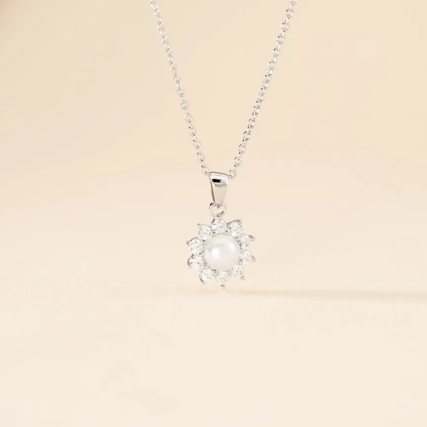 Collier Argent Blanc 925/1000 Fleur Perle De Culture Et Oxydes De Zirconium Sertis Griffes Maille Forçat 45cm